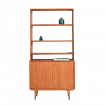 Scandinavian manufactured 60's bookcase cabinet formed by two parts. The upper part is equipped with three shelves with adjustable height. The lower part is a small sideboard or credenza with hinged doors equipped with a lock. Inside the compartment are two drawers and a shelf. Due to the small size can be placed in any room. Good condition. A conservative restoration has been done. Please pay attention to the photographs.