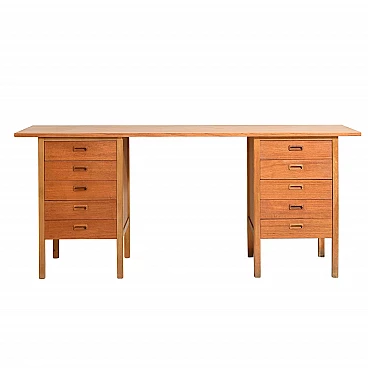 Composed of a large teak board that rests on the two side bases each equipped with five drawers. Good condition, has been carried out a conservative restoration. Are visible inside the adjustments made over time to the drawers.