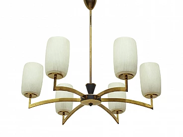6 armed chandelier in the style of Hollywood Regency in brass and glass, 50s