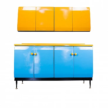 Kitchen set composed by sideboard and wall unit. Structure in repainted metal. Brass feet. Lacquered wood shelf. Rhombus shaped knobs. The sideboard has 3 storage compartments inside. Excellent condition, fully restored and repainted, as pictured. 50's design. The rough appearance of the paint, which is evident in the photo, is due to the clear resin applied to the entire surface that protects it from scratches or bumps and facilitates cleaning. Measurements: Width 151 cm Depth 46 cm - Wall Unit 31 cm Height 94 cm - Wall Unit 51 cm