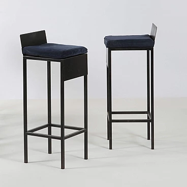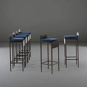 6 Stools with steel frame and dark blue velvet cushions, 80s