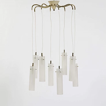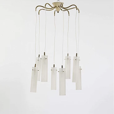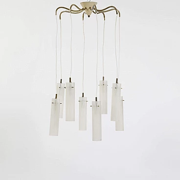 Chandelier in brass and metal with 8 frosted glass diffusers, 50s