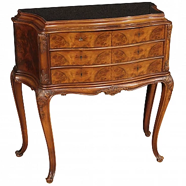 Mid-20th Century Italian Dresser. Carved and chiseled cabinet in mahogany, beech and fruit woods of beautiful line and pleasing decor. Chest of drawers fitted with 6 front drawers of fair capacity complete with a single working key. High leg cabinet equipped with opaque glass top (not original, replaced over time) that has some scratches and signs of wear, without breaks or chipping. Structurally sound, ideal dresser to place in a room or study, for antiquarians and decorators. Presents some signs of wear, overall in fairly good state of preservation.