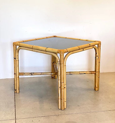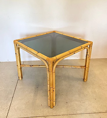70's square bamboo dining table with smoked glass top, wanting the 4 chairs also available.