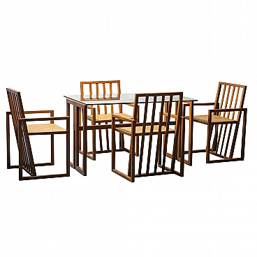 Table with glass top and 4 wooden and Vienna straw chairs, 70s
