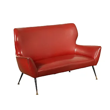 two seat sofa, springs and vegetable hair padding, leatherette covering, metallic enamelled legs with brass tip.