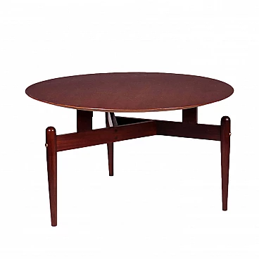 Wood veneer and solid teak center table. In good condition, shows minor signs of wear.