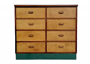 Beautiful vintage wood dresser dating back to the 60's. Structure with mahogany colored veneer, mahogany colored plywood sides; drawers with oak colored veneer. The top is in light green formica. The cabinet has been restored and is in excellent condition. Ideal to furnish a living room, a kitchen, a study, an office, a store, a pub, a bar or restaurant.