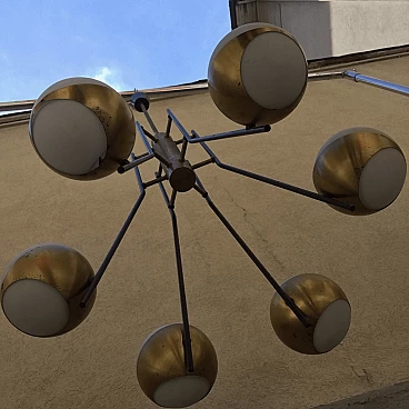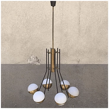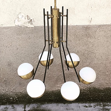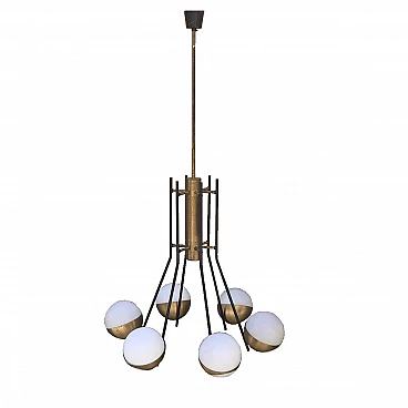 Beautiful and rare chandelier by Stilnovo, made in Italy around 1950. Six arms brass structure and six opaline globular glass shades. Very good condition, needs to be polished.