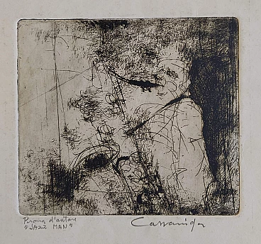Etching Jazz Man Giancarlo Cazzaniga (Monza 1930 - Milan 2013). Encouraged by his father, he dedicated himself to studying painting, attending the Cimabue Academy in Milan from 1950. Immediately after the war he began to frequent the artistic circles linked to the Existential Realism movement, with artists such as Bepi Romagnoni, Mino Ceretti, Giuseppe Guerreschi, Giuseppe Banchieri and Tino Vaglieri, who were looking for a new response and a new way of looking at social realism. A recurring theme in Cazzaniga's works is the nightlife that gravitates around jazz music; his friends were the great Italian jazz musicians: Franco Cerri and Enrico Intra. In 1962 he participated in the XXXI Venice Biennale with a selection of works on the theme of jazz music, the Jazz Man. Another recurring motif in his art is landscapes and nature. In this intense etching, small but scratchy, a jazzman playing his saxophone is depicted. The figure, made up only of light, emerges from the dark background. Captured in the act of playing, the saxophone is recognisable thanks to a few lines. The nervous stroke, the rapid, dense signs intertwine and create the whole composition, and it seems as if we can hear the notes enveloping the jazz player and spreading out from the paper, producing a sort of echo. At the bottom, beyond the engraving, on the left "Prova d'autore/Jazz Men" on the right pencil signature. Excellent impression. Very good condition. Large margins beyond the copperplate stop. Measures in mm 132 x 148, sheet 500 x 349.