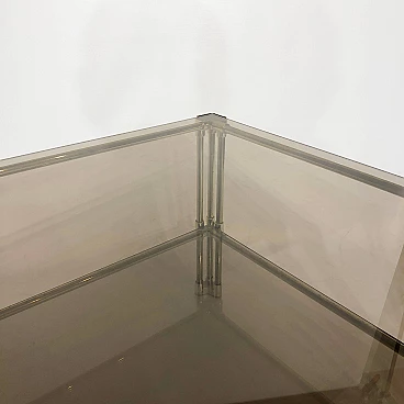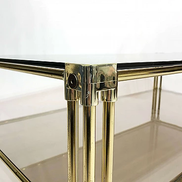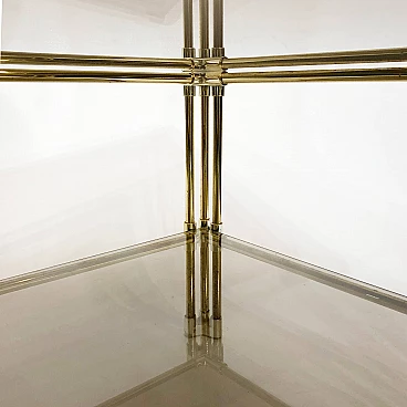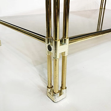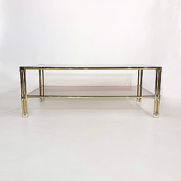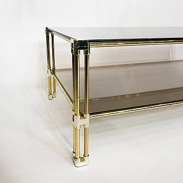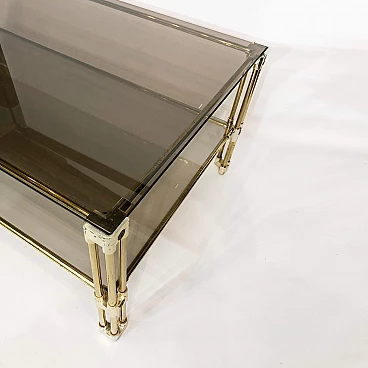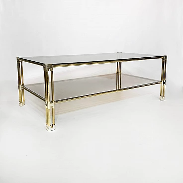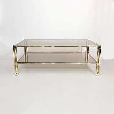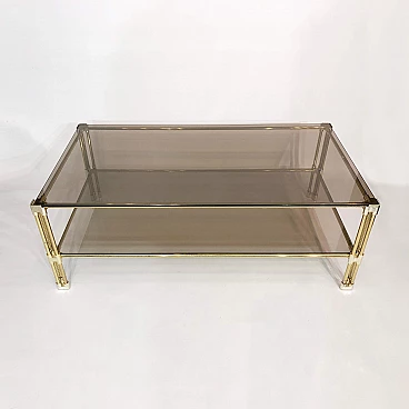 A two-tier brass and smoked glass coffee table is believed to have originated in 1970s Italy. This early example of Hollywood Regency design features two panes of tempered smoked glass, housed in a brass frame. The corners and joints of the frame itself are reinforced in a gold acrylic casing, making it child-friendly.