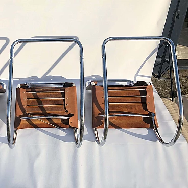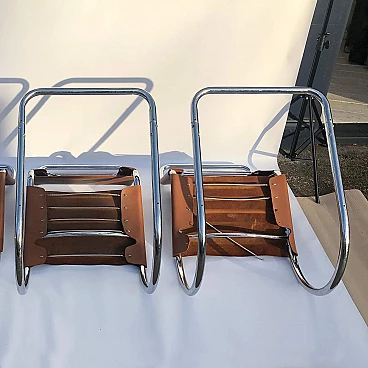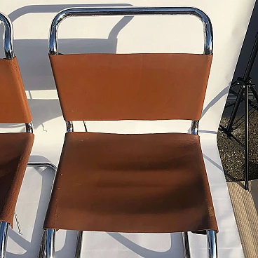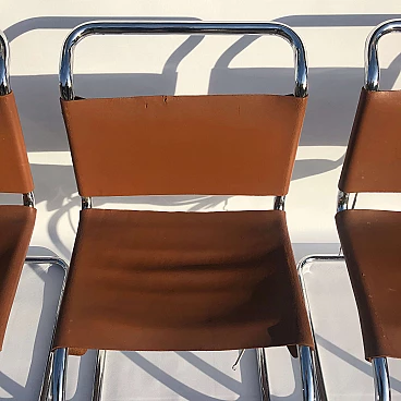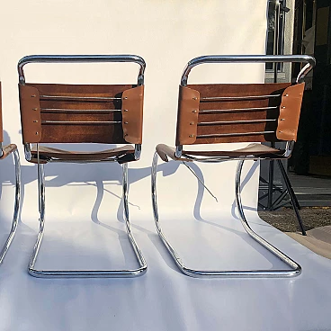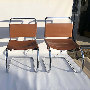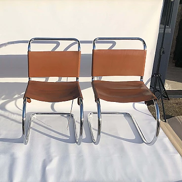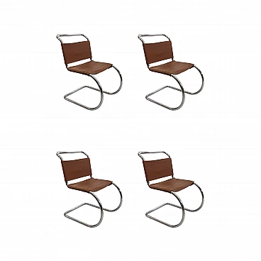Complete set of four chromed metal MR10 chairs by Ludwig Mies van der Rohe, in brown leather. This chair set is an early 1960s example of his famous design produced by Knoll International. The MR10 chair was first designed in the 1920s, this set of four chairs features chrome springs on the backs and seats. Later the design was improved, with a shortening of the springs and a return to a corset-like elastic cord. The chairs still bear the oval sticker marks on the back of the seat bottoms.