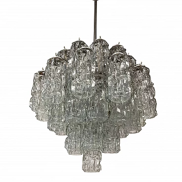 Pair of chandeliers consisting of three tiers of frosted glass, 1960s. Restored and overhauled. Chromium-plated structure. Chandelier height: one 55 cm, the other 45 cm.