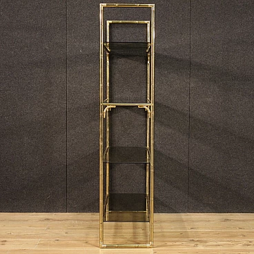 Italian bookcase / display unit from the 1970s. Gilded and chiselled metal faux bamboo / woven wood cabinet with opaque glass shelves. Open display unit complete with 4 good serviceable shelves, one shelf has two small chips in the corners (not pictured). Good solid glass shelves (with some scratches), ideal for displaying collections. Finished centrepiece bookcase, of excellent proportion, to fit into a living room or study. Structurally sound and solid piece of furniture, shows some signs of wear, in nice patina. Overall in good state of preservation.