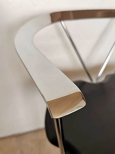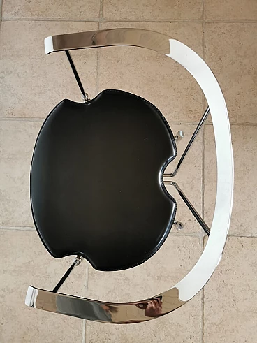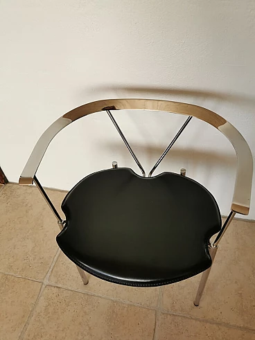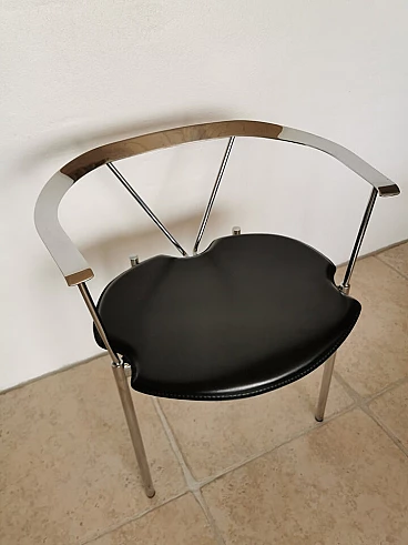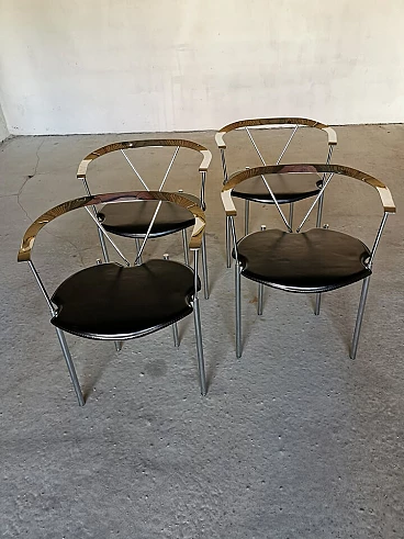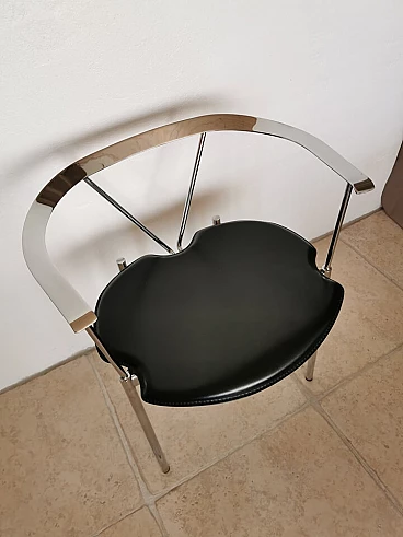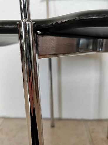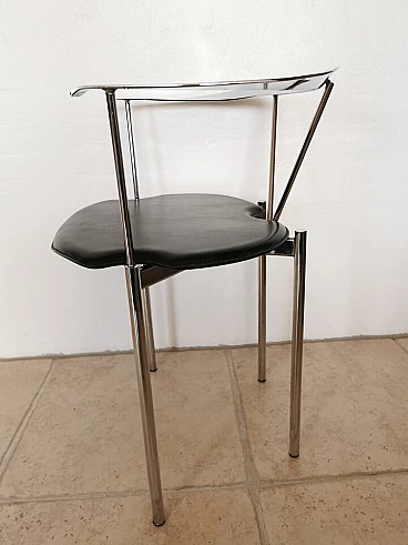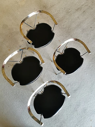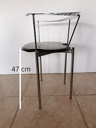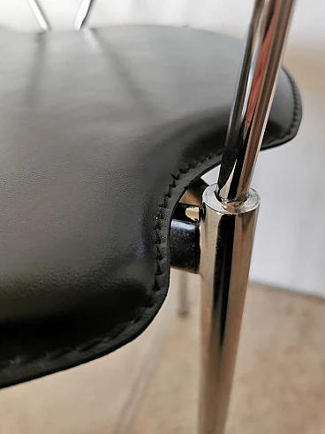 Set of 4 Italian dining chairs from the 1980s. Elegant and minimalist, they have a chrome frame with black full grain leather seats.