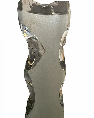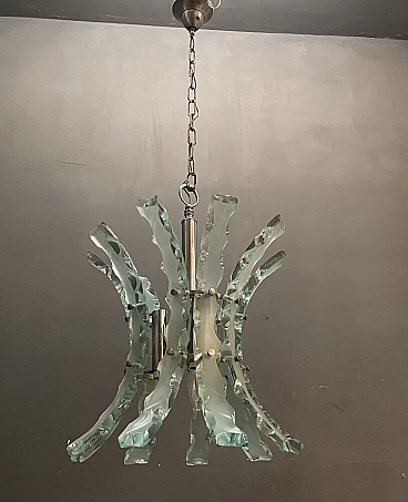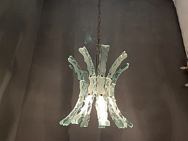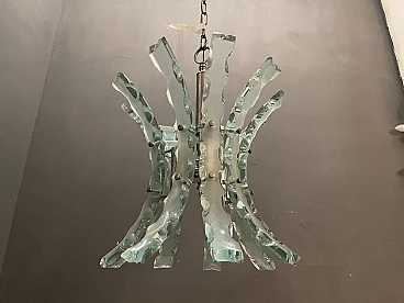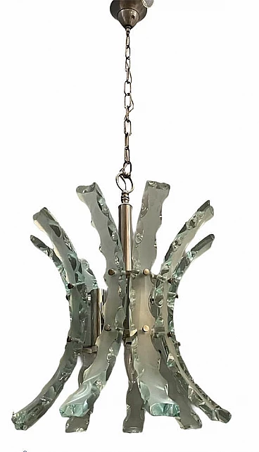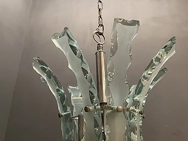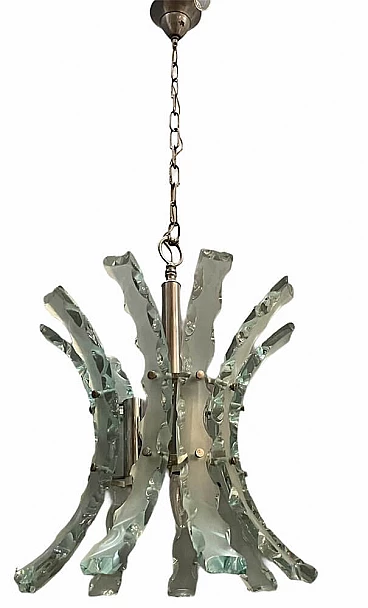 Composed of 9 pieces of glass worked by hand on a chrome structure Height without chain 38 cm Height with chain 105 cm 3 lights, requires E14 bulbs Small damage on some pieces of glass not visible once hung. Shipped in a wooden crate for safe arrival