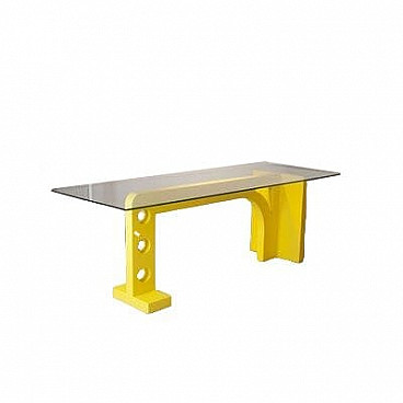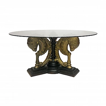 A splendid example of early Hollywood Regency design, this brass ram's head table - dating from the late 1960s/early 1970s - would bring a touch of American glamour to any interior. Atop a three-pronged black oak base sit three brass moulded rams in rich golden brown tones. A central black brass column completes the base of the table. The elegant curve of the heads together support a circular dish of elegant brown smoked glass - perfect for coffee table books, vases or any ornament. The ram's heads were made by filling two half moulds with brass, then combining them together. Because of this, the natural patina differs on each half - one half of the head is more patinated than the other, giving this coffee table a truly unique finish. Brass, oak, glass. Wear consistent with age and use. The base has some general wear - as it was made from brass moulds, one half of each ram is more patinated than the other. GLASS DIAMETER: 100cm | 39.6in BASE DIAMETER: 57.5cm | 22.6in