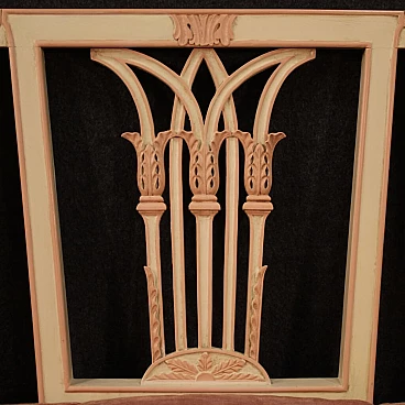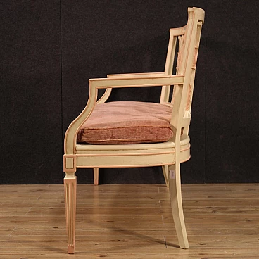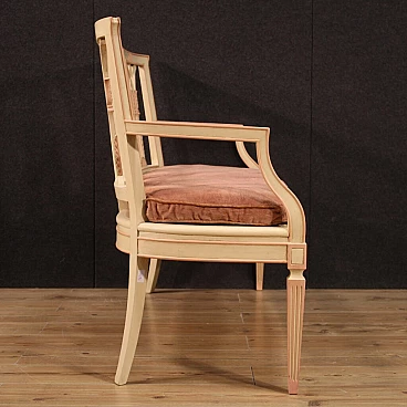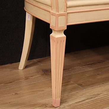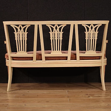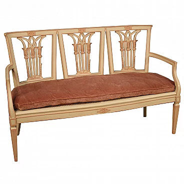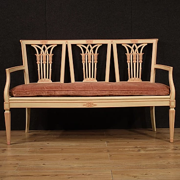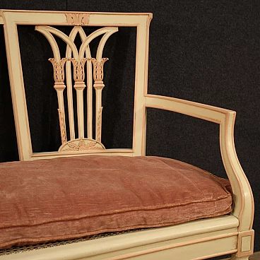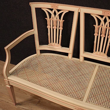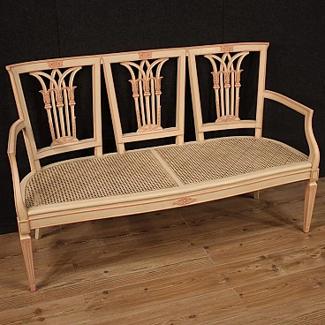 Louis XVI style sofa from the mid-20th century. Carved, lacquered and painted wooden furniture with a Vienna straw seat in excellent condition. Three-seater sofa with armrests, supported by 4 solid legs in the shape of a truncated inverted pyramid (see photo). Backrest adorned with finely chiselled decorations (see photo). Finished centrepiece, ideal for a living room, very elegant and pleasantly furnished. Sofa with fabric cushion with some small signs of time. In good condition. Seat height 51 cm.