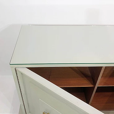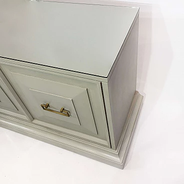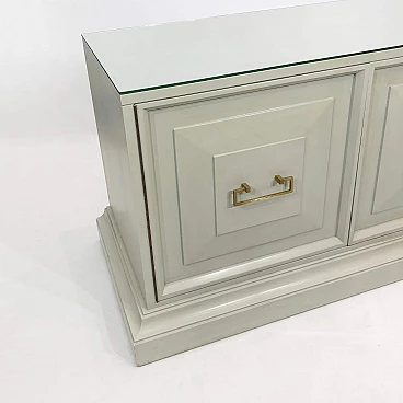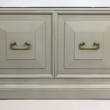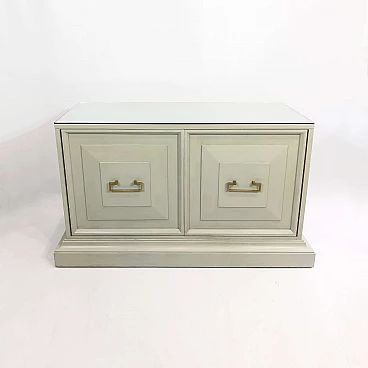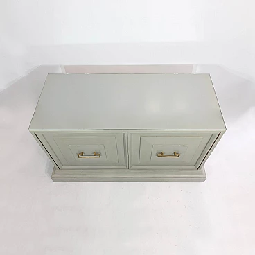 An elegant yet robust cabinet in a light duck egg blue sits atop a plinth in this stunning neoclassical inspired piece from ‘70s America. There are elements of chinoiserie in the design of the cabinet. The hinges are made of brass, whilst the handles are brass finished with a gilt. On the top of the cabinet lies a clear protective pane of glass, ideal for displaying any ornaments or lamps.
