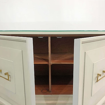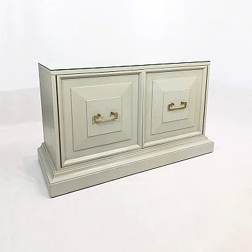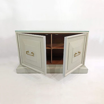 The cabinet has two doors, each with its own Greek-key style handle. Inside the cabinet there is one separating shelf, perfect for storage.