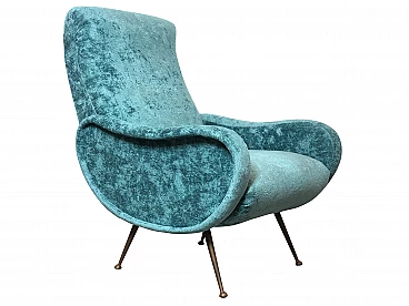 Lady armchair, 1950s. Production Arflex, design Marco Zanuso. A masterpiece of Made in Italy, Lady was awarded the Gold Medal at the IX Triennale di Milano in 1951. The armchair is made in Italy and upholstered in light blue boucle chenille fabric, the unmistakable style of the shell by designer Marco Zanuso, brass feet with the typical design of the 1950s. Completely restored. Perfect condition. Measurements: Seat height cm 45- Seat cm 53 X cm 50