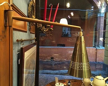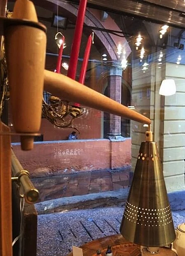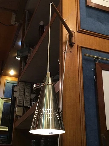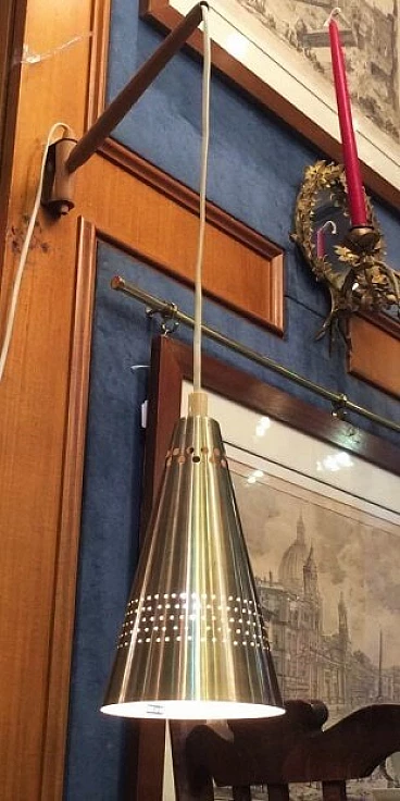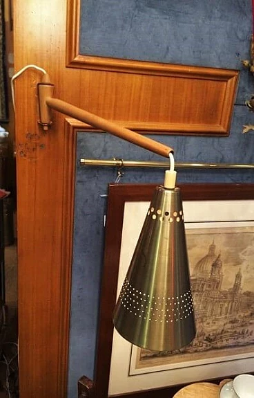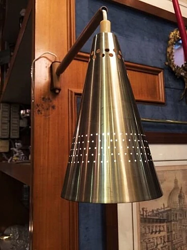 The wall lamp is made of teak wood and brushed metal. There are two salient features: the decoration of holes that adorns the metal hat that, in addition to enjoying the geometric beauty, allow a light but effective diffusion of light and the ability to adjust the height of the hat from the ground, thanks to the possibility of sliding the electricity cable inside the wooden arm. Measurements: wooden arm length 34.5 cm; pin height 10.5 cm; hat height 20 cm; diameter at the base 12.5 cm.