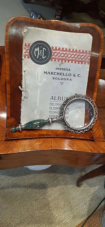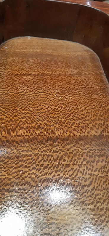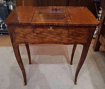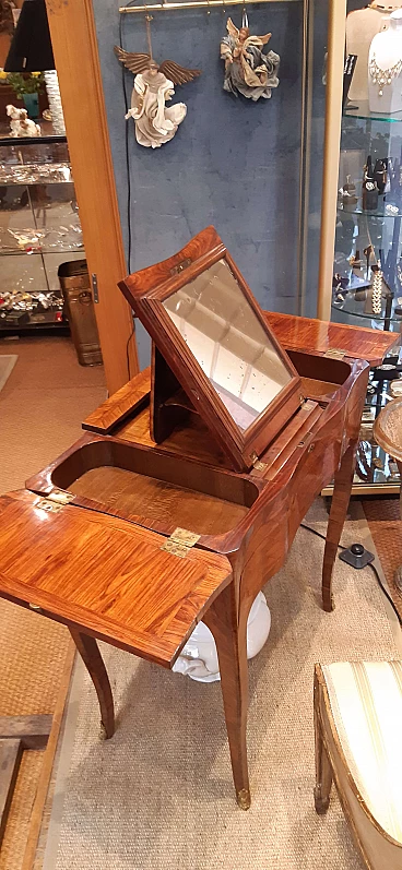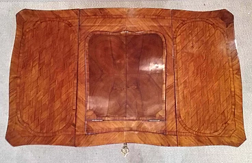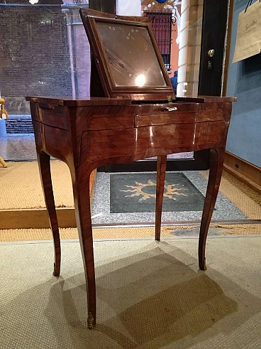 Its elegance is accentuated by the sinuous lines and the rosewood inlay, surrounded by the essence of rosewood. Its uniqueness lies in the multi-functionality, a feature dictated by the needs of the client, so that the furniture can serve simultaneously as a desk or lectern, simply by tipping the mirror in mercury. Lifting the two outer wings of the shelf are then placed two storage compartments paved in precious snake wood. The piece of furniture reaches its maximum versatility thanks to the peculiar possibility of separating the shelf in block from the legs, thus obtaining two independent pieces: a mobile dressing table/desk - or a shelf for bed service - , and a simple table wonderfully decorated with chinoiserie painted on lacquer. 102cm in width when open.