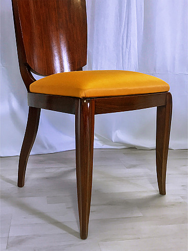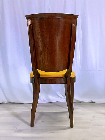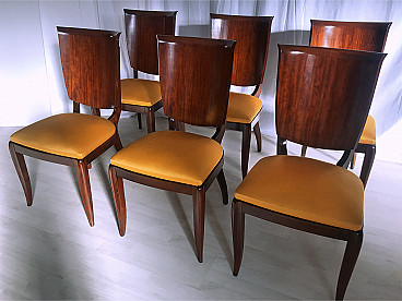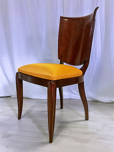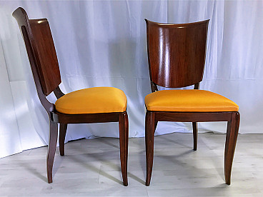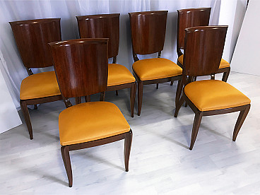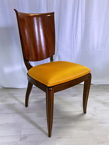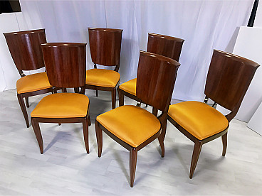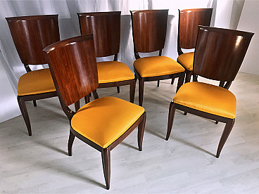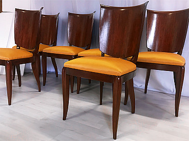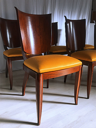 Elegant lines and solid structures for this gorgeous set of six chairs designed by Vittorio Dassi in the 1950s. Their wood surfaces have all been recently shellac polished and are in excellent period condition, as are the seats upholstered in golden yellow silk satin with their fillings. They are in excellent condition with no tears or other defects.