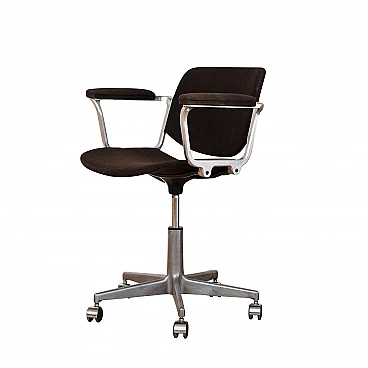 Swivel office chair with wheels, model DSC 108 by Giancarlo Piretti for Anonima Castelli. Aluminium frame, seat and back in original fabric, dark brown colour. The mechanism of rotation and seat height adjustment is functional; seat height 45-55cm. Original label (partly torn), article in good overall condition with patina. Italian modern antique from the late 1960s.