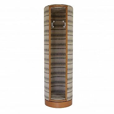 60s cylinder walk-in closet with wooden structure and fabric upholstery.