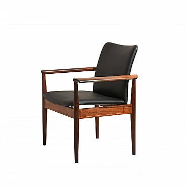 Vintage 'Diplomat 209' armchair by Finn Juhl for France & Søn / France & Daverkosen, 1960s. Model 209 desk chair by Danish designer Finn Juhl as attested by the original stamp. Features a solid rosewood frame, upholstered seat and back. The uniquely shaped armrests are made of curved wood. It has been reupholstered with black leatherette.
