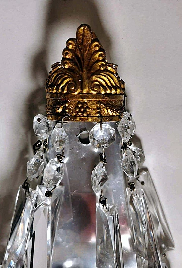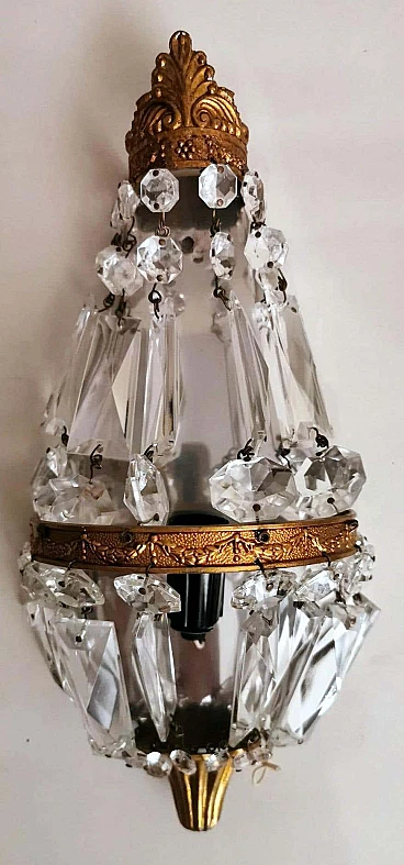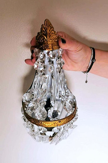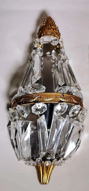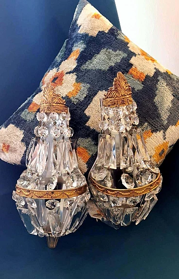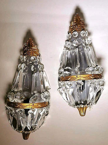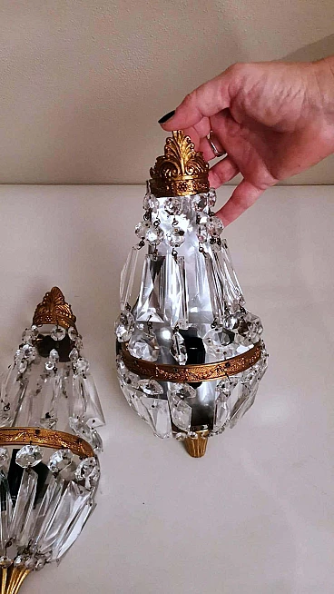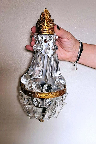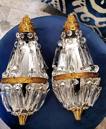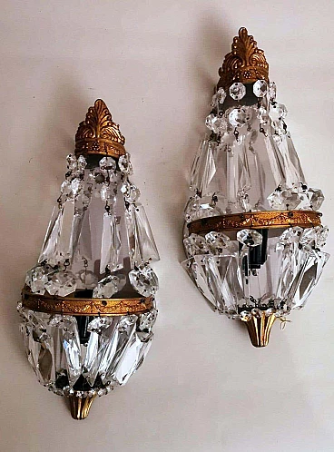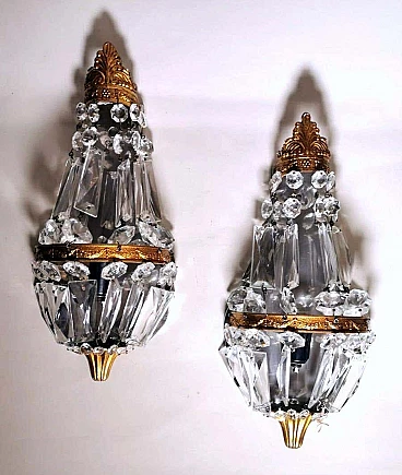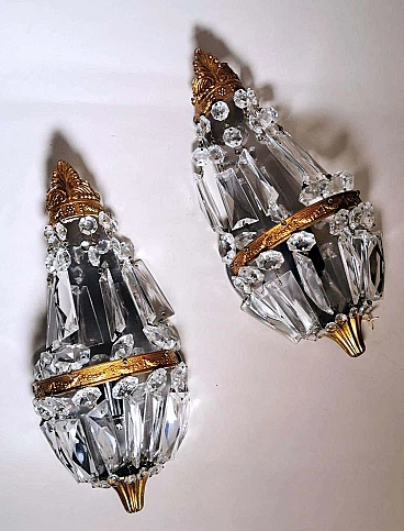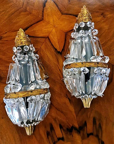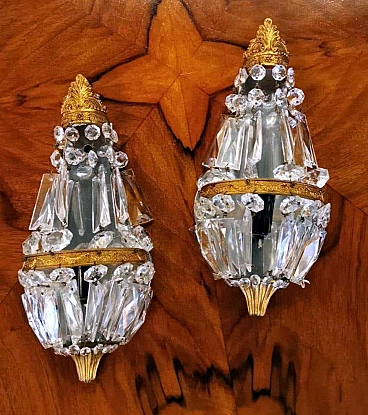 Small and graceful pair of wall sconces with the typical balloon shape. The brass structure is enriched by refined decorations depicting soft garlands, the entire frame of each sconce is adorned with lead crystals, cut, ground, and faceted, joined together manually by metal wires. The shape of the two sconces is the classic balloon type of the Louis XVI period. They were handcrafted between 1905 and 1910 by an unknown craftsman in the suburbs of Paris. The sconces have a single point of light, but when lit, the ground crystals refract the light with infinite facets, and enchanting reflections are created that enhance their decorative effect. The electrical system is working but the wiring is European, the compatibility of the voltage in other countries must always be checked by an electrician before use.