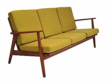 Danish retro 3 seater sofa, 60s. Brand new loose cushions. Quality felt-like carry-yellow furniture wool fabric. Teak armrest, the rest of oak. Original springs are retained. Manufactured by a Danish furniture manufacturer in about 1960. Restored-reupholstered professional upholsterer, craftsman. Wooden components has no defects, but it may show slight traces of use.
