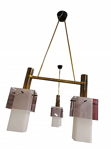 Italian production from the '60s. Suspension lamp composed of 2 square-shaped opal glass lighting bodies decorated with lilac-coloured plexiglass bands, brass fittings and vertical connections.