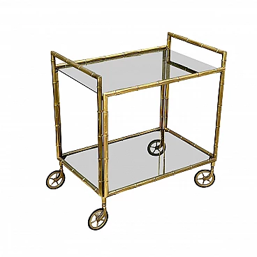 Faux bamboo bar cart in brass with removable glass tray, 60s.