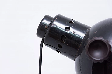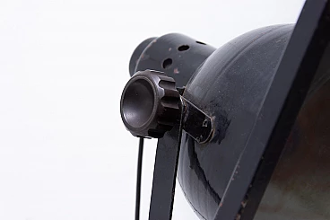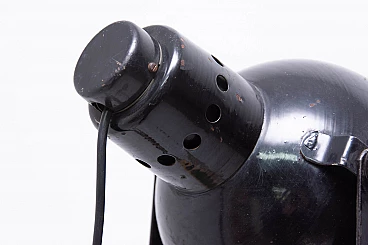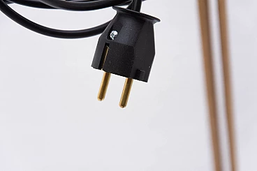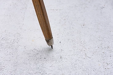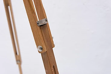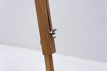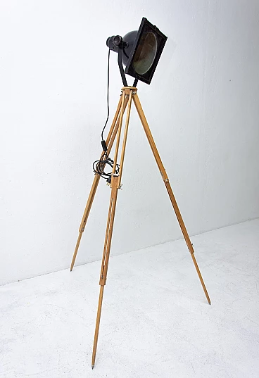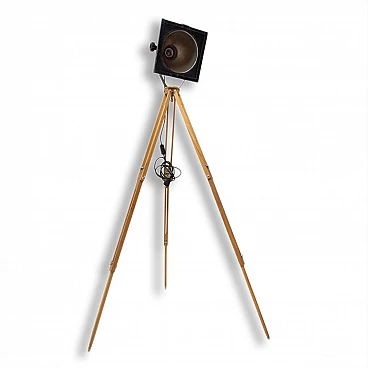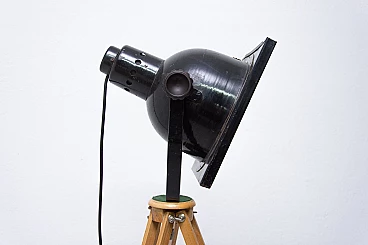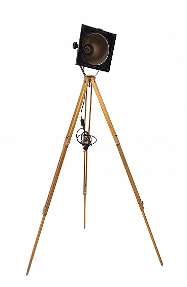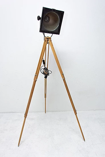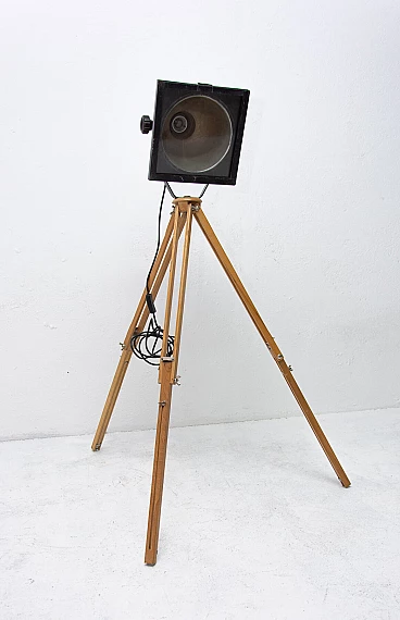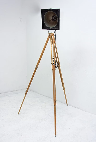 Spotlight on wooden tripod. It was made in the former Czechoslovakia in the 1970s. Height and angle adjustable (maximum height 130, minimum height 104). It has an original rounded lampshade with a square grid. In very good condition. New wiring. One E27 bulb. There are currently 20 pieces of these lamps of various types in stock. If you are interested in more pieces please write to us.