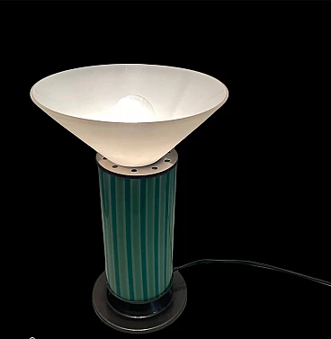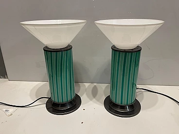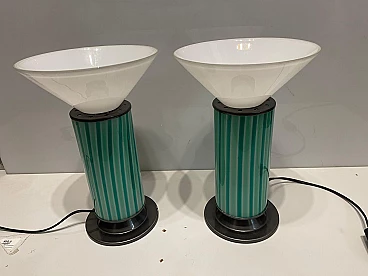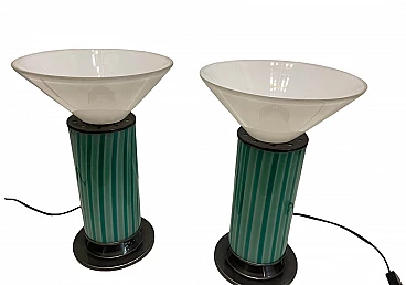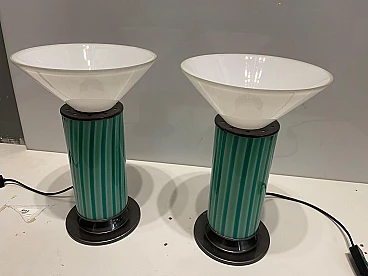 Pair of mint green Murano glass table lamps, 1970s. Opal white glass shades, green striped Murano glass center pieces resembling striped candy canes. Gray metal bases show some scratches. The glass is intact. Shipping In a wooden crate for safe arrival.