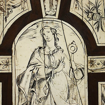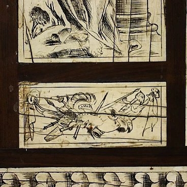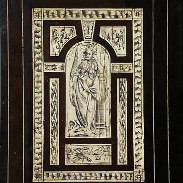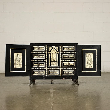 Neapolitan cabinet dating from the first quarter of the 17th century. On the front it has two doors (originally a single door) giving access to the inner part, where there are three side drawers framing a door concealing a compartment and two small drawers, and a single drawer in the lower part. The sides are made of ebony with ivory threading, while the top is made of ebony wood and decorated with ivory threading; the interior is made of fir. The cabinet is entirely inlaid with engraved ivory reserves. On the inside, a ribbon frieze runs between the drawers, the front of which is decorated with landscapes inhabited by travellers or in which battle scenes take place; the door in the centre depicts a woman with bare breasts and a cornucopia overflowing with flowers and fruit, probably an allegory of Abundance. The doors are also inlaid with ivory reserves with frets and leafy festoons; one depicts a martyred saint with a palm and a column, presumably Saint Bibiana, while the other depicts a female figure holding an anchor, an allegory of Christian hope. Also on the inside of the doors there are ivory reserves engraved with female figures, one unidentifiable and one turreted, raising a ring above her head, probably an allegory of Faith; these two were readapted from a coeval cabinet made by a different workshop, presumably inserted in the 19th century during the transformation of the single door into two doors.