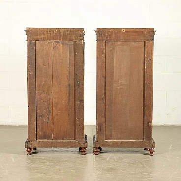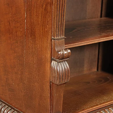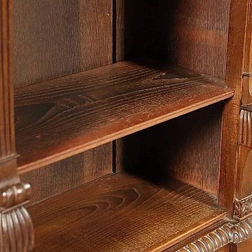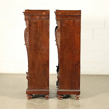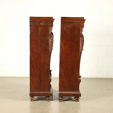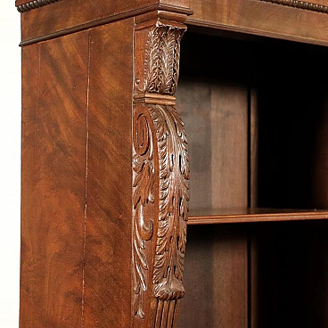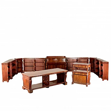 Genoese library attributable to Henry Thomas Peters, consisting of a large consultation table, bookrest, wall cupboard with writing compartment and eight bookcases with racks, three of which are paired, of different sizes; one of the pairs has two doors, which originally bore a grille. The carvings on the uprights all show slight differences in design. The furniture is made of mahogany and veneered with mahogany feathers, with oak interiors; the locks are marked "VAGO", an important Milanese company. The library can be attributed to Peters because of the style and high quality of the carving, both of the uprights wavy and worked with leaf motifs, and of the pincered frames and lion feet that support the lectern. The taste in carving is clearly inspired by the Palagians.