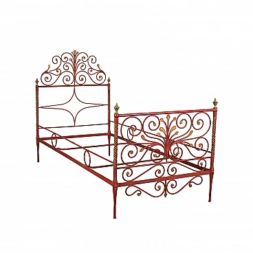Bed made of wrought iron and brass, lacquered red and partially gilded, decorated with a scroll motif. Above the uprights of the two headboards are brass vase elements.