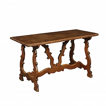Refectory walnut table, supported by legs connected by crosspieces and arrows carved in scrolls; single axis plane. It has undergone changes and replacements.