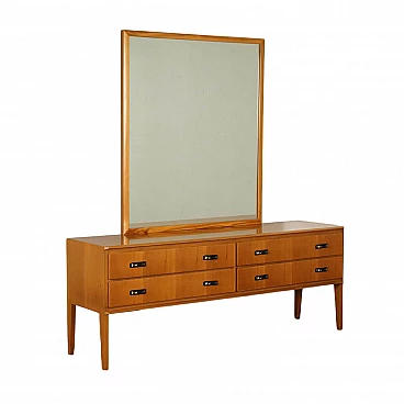 Dresser with mirror, blond mahogany veneer wood, brass handles.