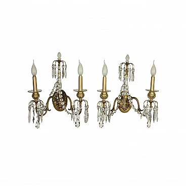 Pair of gilt bronze Art Nouveau wall lights, with boubache and bevelled glass stem, decorated with glass pendants and necklaces; two lights.