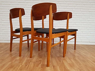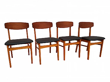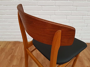 Danish furniture manufacturer four dining chairs with teak back ang beech frame. Completely restored by furniture craftsman. Seat new reupholstered in black artificial leather - skai. Wooden components has no defects, but it may show slight traces of use. This vintage item is in very good condition because it has been refurbished through new upholstery and/or refinishing.