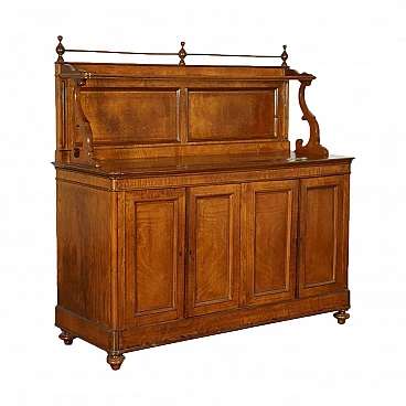 Cupboard supported by refined feet; it has four doors and on top an extension with a shelf that is supported by 2 curved pillars and decorated with pinnacle elements; ash tree veneered.