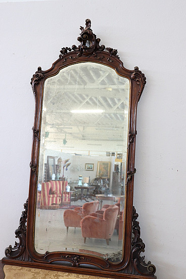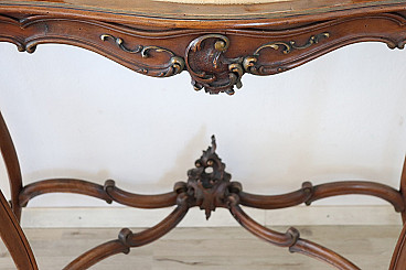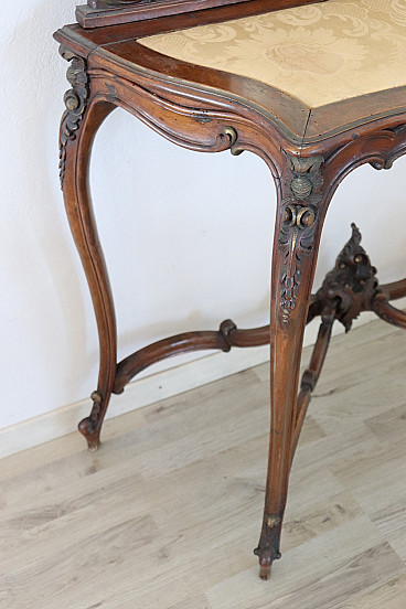 Beautiful and elegant walnut console table with refined decoration carved in wood with curls and scrolls, late 19th century. The line is reminiscent of the refinement of the Louis XV era with slender legs. The top is upholstered in elegant yellow damask fabric. Perfect to decorate any room in the house, from the entrance to the living room. Excellent condition, we recommend that you look in detail all the attached photos. Proposed at an excellent price negotiable, we invite you to send us your proposals to purchase we will evaluate with pleasure. Professional packaging, insured shipping with couriers, delivery by appointment only street level, no porterage to the floors.