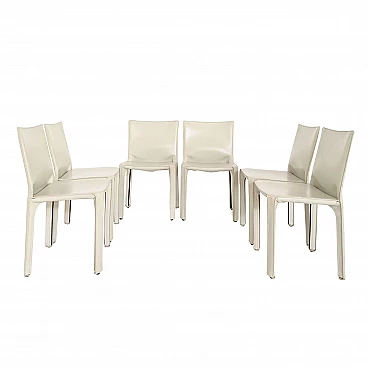 "A new kind of chair, all in leather, today very cloned". This is how Mario Bellini describes the Cab chair/armchair produced by Cassina, a best-seller created during the golden age of Italian design. Cab is the first chair in the world to feature a self-supporting leather structure inspired by the relationship between skeleton and leather. Its upholstery is made up of 21 leather parts, die-cut one by one and then subjected to 22 manual processes. The upholstery is then fitted onto a steel skeleton and zipped up like a tailor-made suit. Complete set of six chairs in the rare ivory colour. The preservation conditions are really very good since the chairs have only been used for a short time. In fact, only slight signs of age are present.