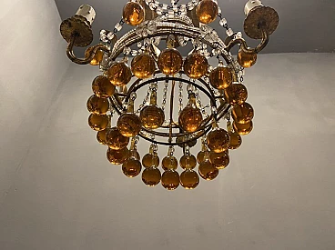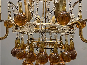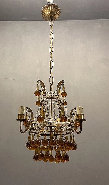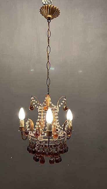 Small Venetian chandelier with Murano glass drops. Crystal beaded frame with exquisite Murano glass drops. Height with chain and canopy 88 cm. Height without chain and canopy 38 cm. Comes with 3 lights. Requires E14 bulbs. New wiring installed compatible with UK, Europe, USA. Shipping in a wooden crate for safe arrival.