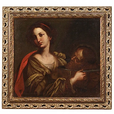 Antique Italian painting from the second half of the 17th century. Oil painting on canvas depicting religious subject Salome with the head of the Baptist by an excellent painterly hand. Painting of good size and pleasant impact for antique dealers, interior decorators and collectors of ancient sacred art. Modern frame in wood and plaster sculpted and silvered with beautiful decoration. Work that has undergone conservative restoration, re-staining, frame replacement and colour restoration in some places (see photo). In beautiful patina, overall in good state of preservation. Painted light H 63 x W 68 cm.