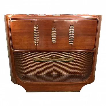 Rare and sophisticated bar cabinet designed by Vittorio Dassi for Permanente Mobili Cantù, Italy, 1950s. Refined mahogany structure with oval red marble top, three doors one of which is reclinable and a small oval glass shelf. Elegant stripped brass elements and decorated internal compartment. In excellent conditions.